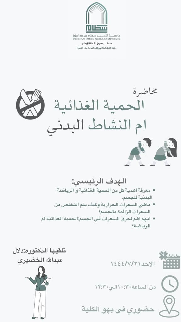 The Student Work Unit, represented by the Sports Activity Section in the college, held two lectures, the first entitled "First Aid for Sports Injuries" presented by Mrs. Nora Al-Tamimi and the second entitled "Diet or Physical Activity? Presented by Dr. Dalal Al-Khudairi on the morning of Sunday 21-7-1444 AH in the inner hall With the aim of developing first aid skills for sports injuries correctly and on scientific basis and knowing the importance of both diet and physical exercise for the body.