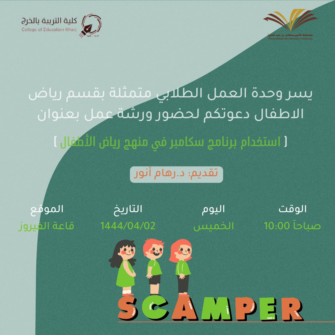 the Student Activities Unit, in cooperation with the Kindergarten Department, presented a workshop entitled Using the Scamper Strategy in Kindergarten Curricula, which dealt with how to develop children's creative thinking through daily activities. From kindergarten using the scamper strategy. The workshop was presented by Dr. Reham Anwar in the Fayrouz Hall at the college on 27/10/2022,