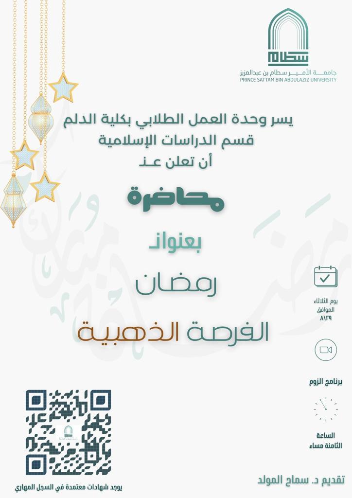 The Student Work Unit at the College of Education organized a lecture entitled "Ramadan the Golden Opportunity", on Tuesday evening, the twenty-ninth of Sha'ban for the year 1444 AH, via Zoom.