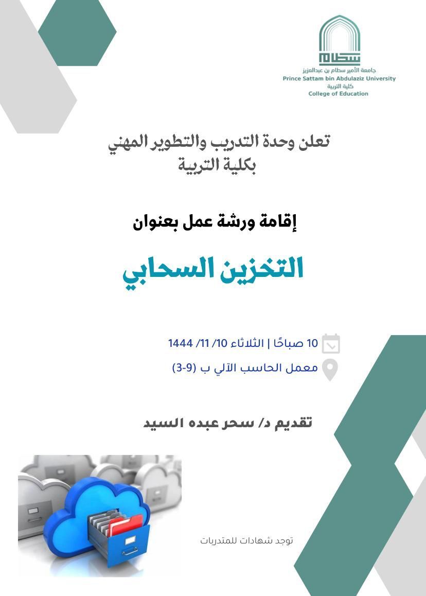 The Training and Professional Development Unit of the college held a workshop entitled Cloud Storage on the morning of Tuesday, the tenth of Dhu al-Qi`dah for the year 1444 AH, and it targeted members of the teaching and administrative staff.